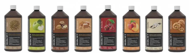 - Åtta varianter tillgängliga, inklusive äpple, anis, hasselnöt, karamell, körsbär, persika, vanilj och valnöt
