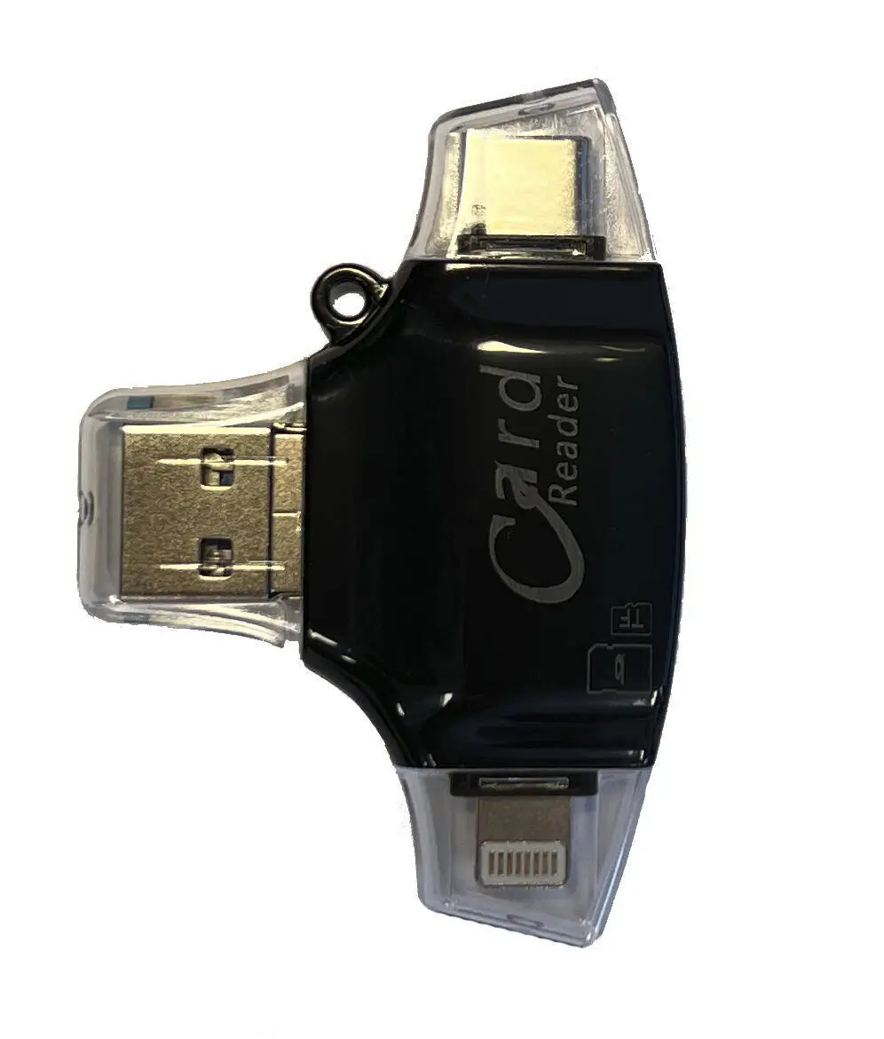 Multikortläsaren ansluts via USB-porten på din dator eller via en USB-anslutning (laddkontakt) till din telefon. Denna modell är utrustad med en Lightning-anslutning för iOS-enheter och en USB-C-anslutning för nyare telefoner och datorer.