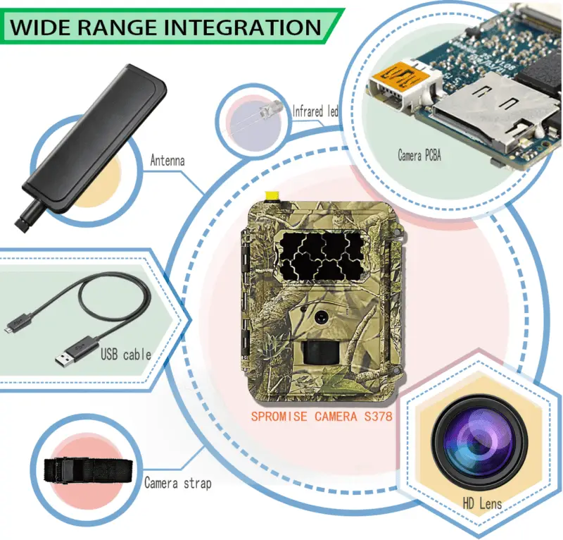 Spromise 378 - med svart IR och 4G sändarmodul - är det bästa valet för övervakning av djur- och hemsäkerhet. Kameran är gjord av ABS-material, som är robust, rostfri, hållbar och motståndskraftig mot höga och låga temperaturer. Hela 30 meters rörelsesensor (PIR) detektionsräckvidd.