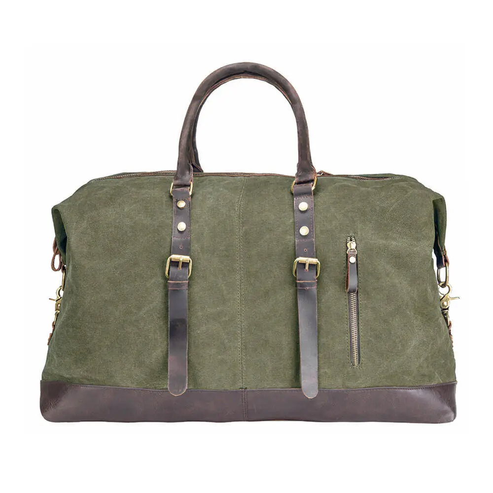 Sandhamn resväska är tillverkad i olivgrön canvas med bruna detaljer i imiterat läder.