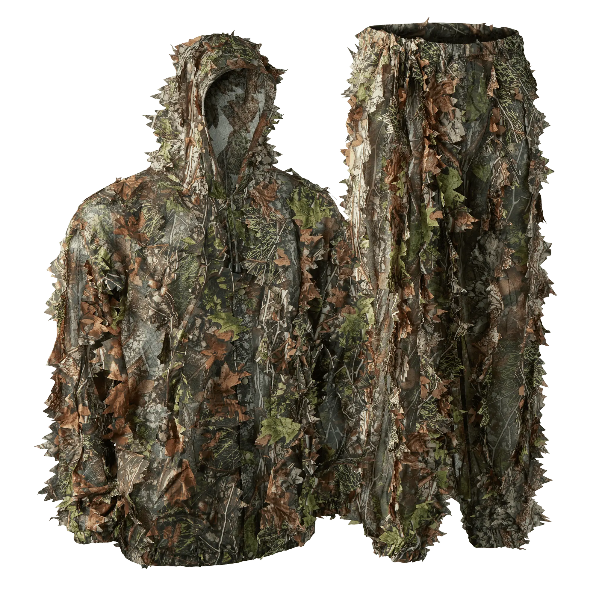3D-camouflage-set för jakt och djurobservation med justerbar jacka och byxor med resår.