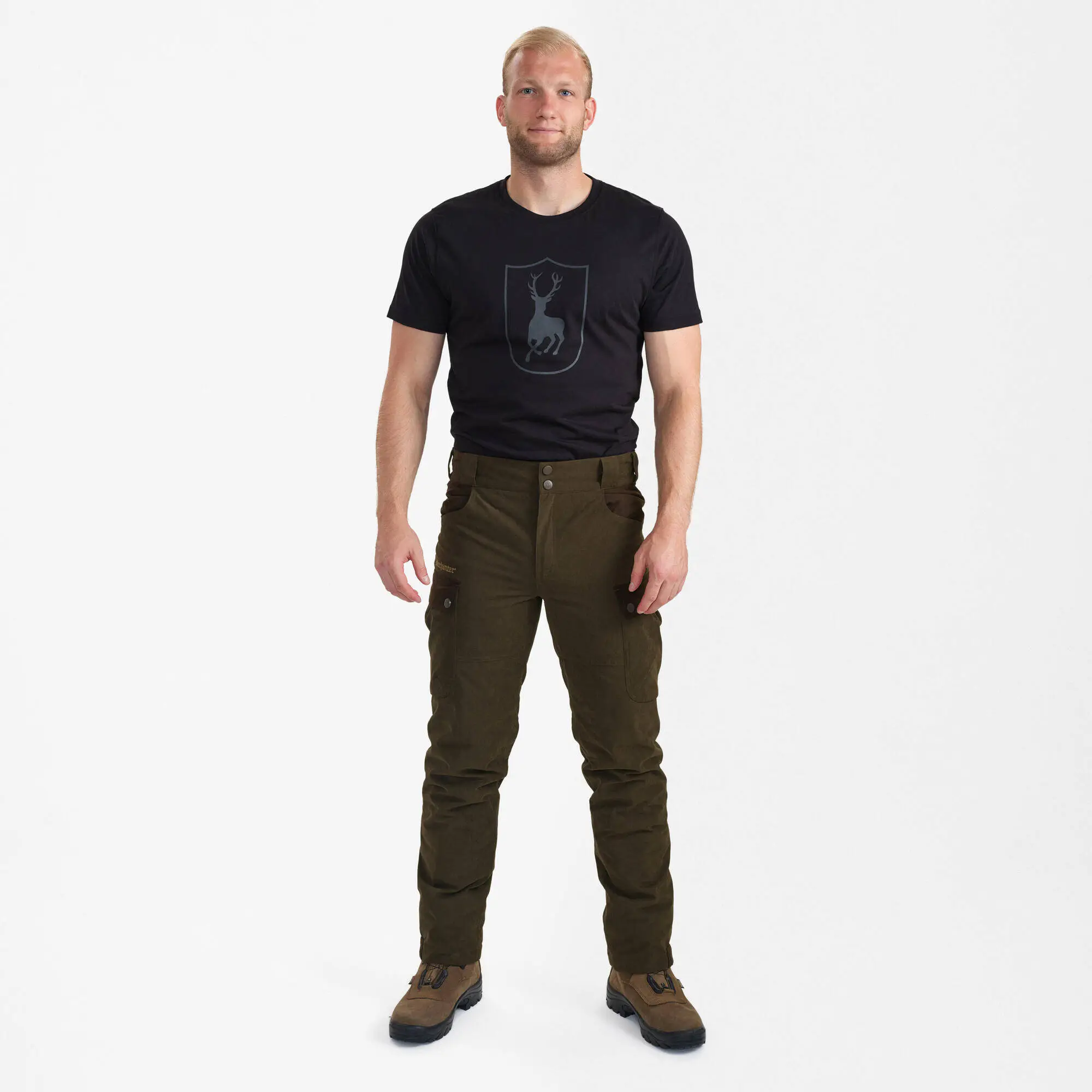 Dessa byxor har en förfinad design med detaljer i imiterat mocka som inte bara förbättrar estetiken utan också ger praktisk nytta. De är konstruerade med en Deer-Tex® Performance Shell-membran som är både vind- och vattentät samt andningsbar, vilket är A och O för en aktiv jägare. Kombinationen säkerställer att du alltid kan behålla en behaglig kroppstemperatur, oavsett om du står stilla eller är på väg.