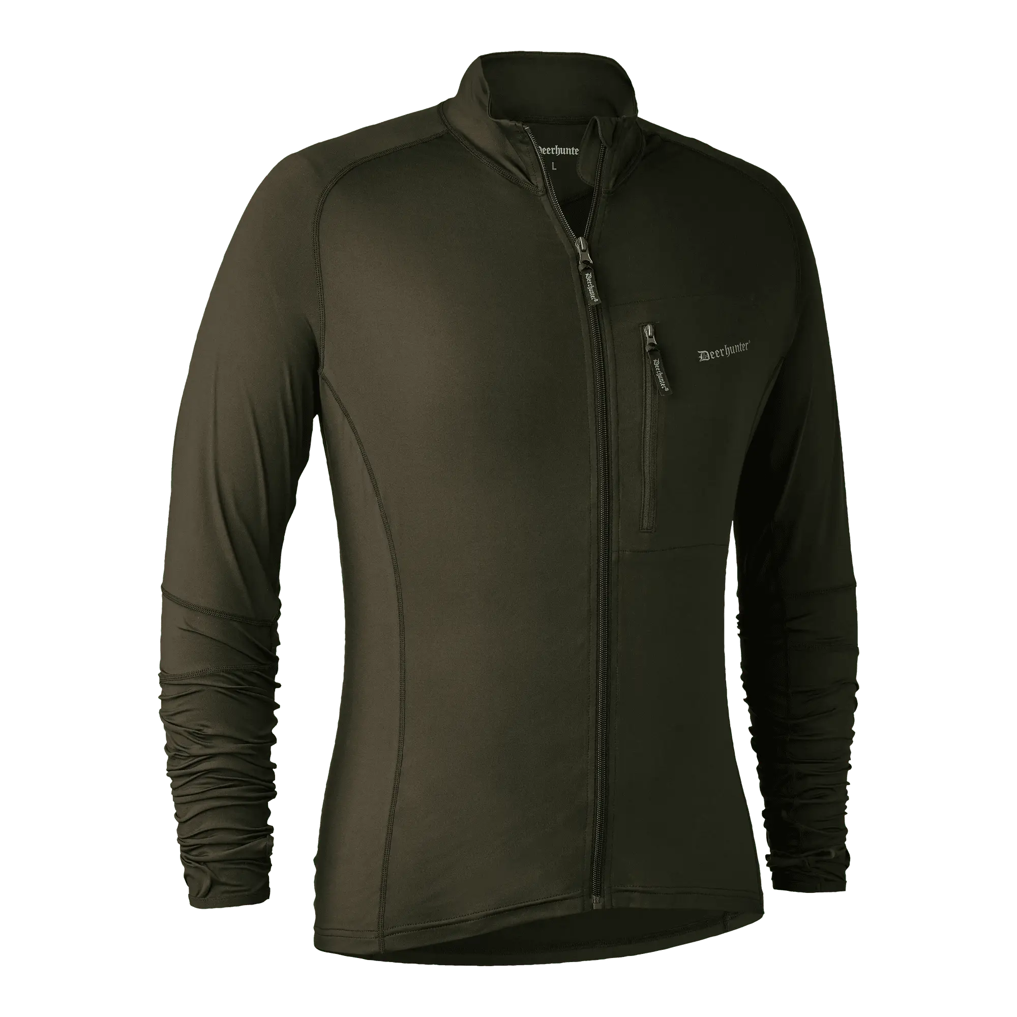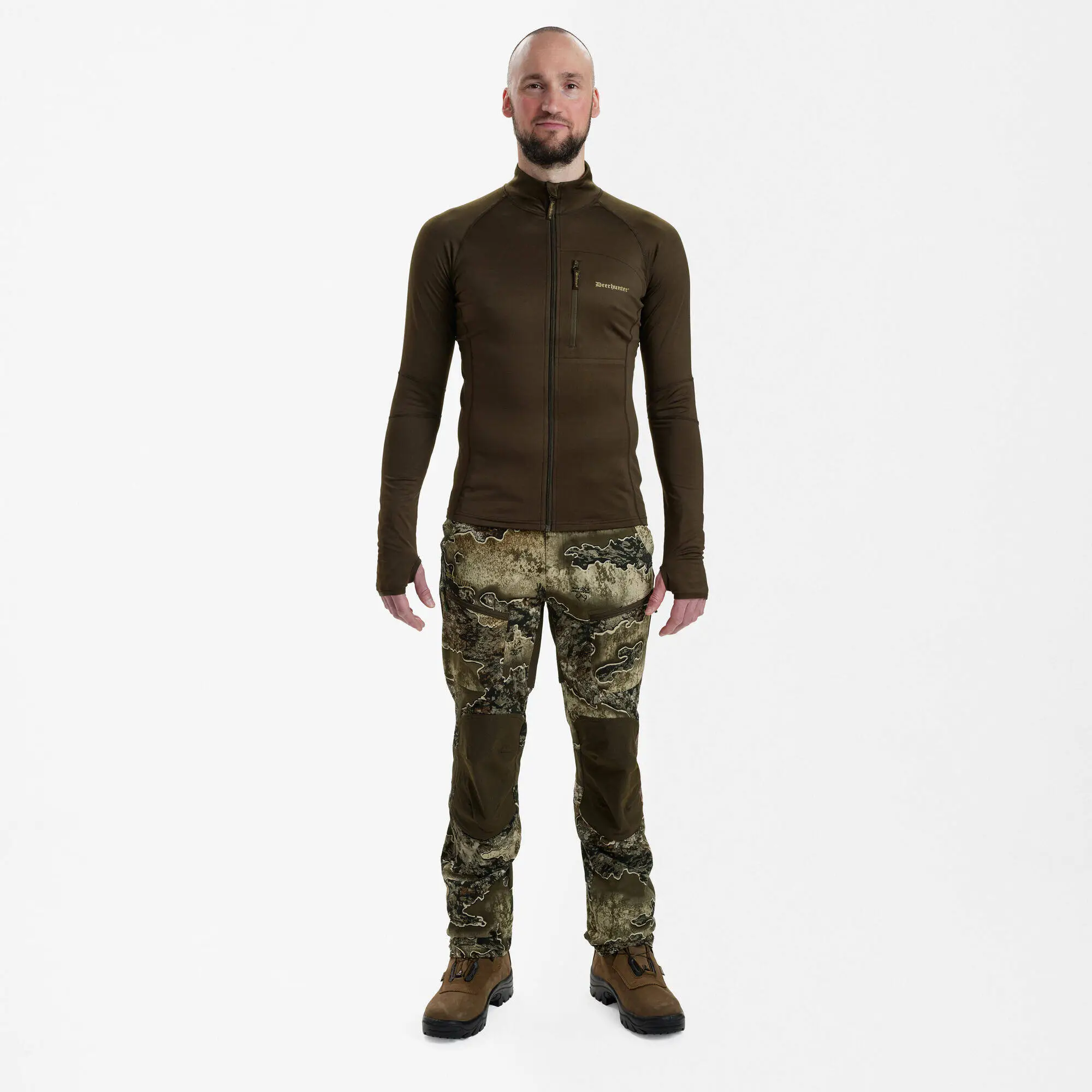 Flexibilitet och komfort är avgörande när det gäller kläder som ska klara de växlande förhållandena under jakt. Denna cardigan är designad med fokus på maximal rörelsefrihet, så du kan fokusera på det viktiga utan att störas av obekväma kläder. De elastiska panelerna vid armbågarna och längs sidorna samarbetar med tumhålen för att säkerställa att cardiganen känns som en naturlig förlängning av din kropp. När temperaturen sjunker och daggen gör omgivningen kyligare blir den andningsbara strukturen ett viktigt element som håller dig varm utan att överhetta.