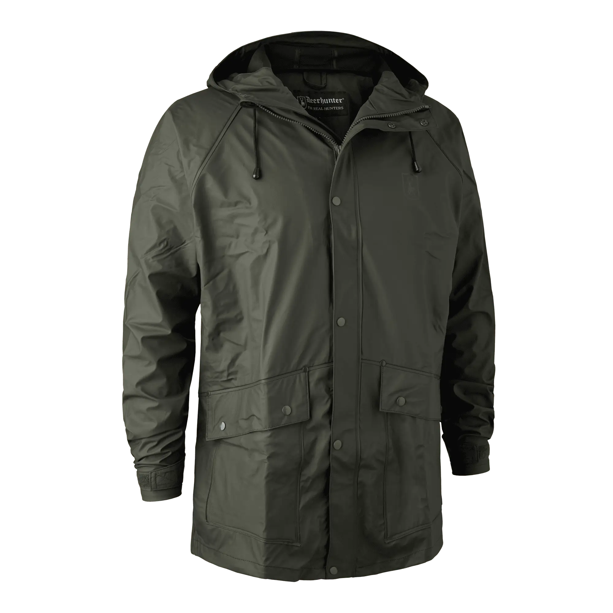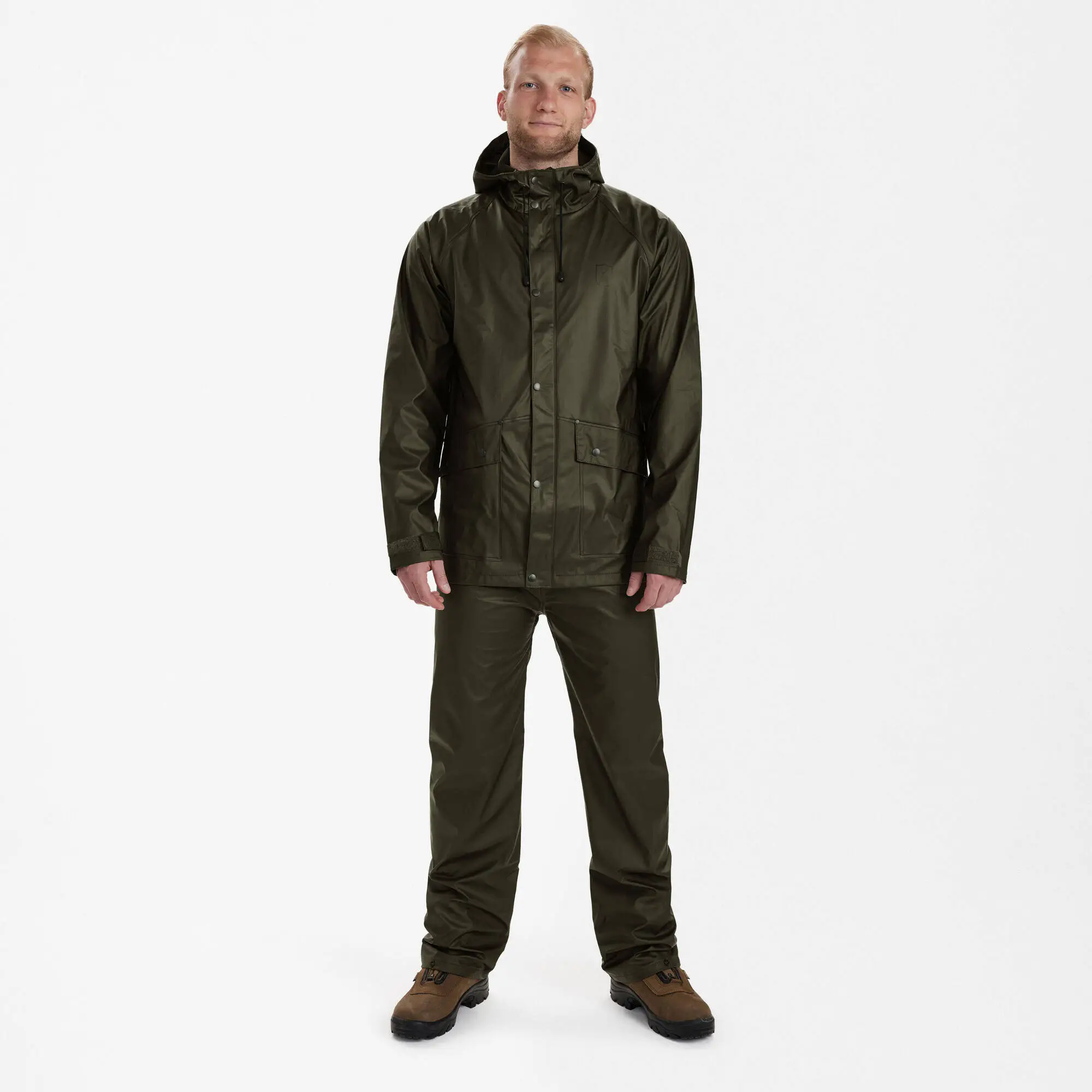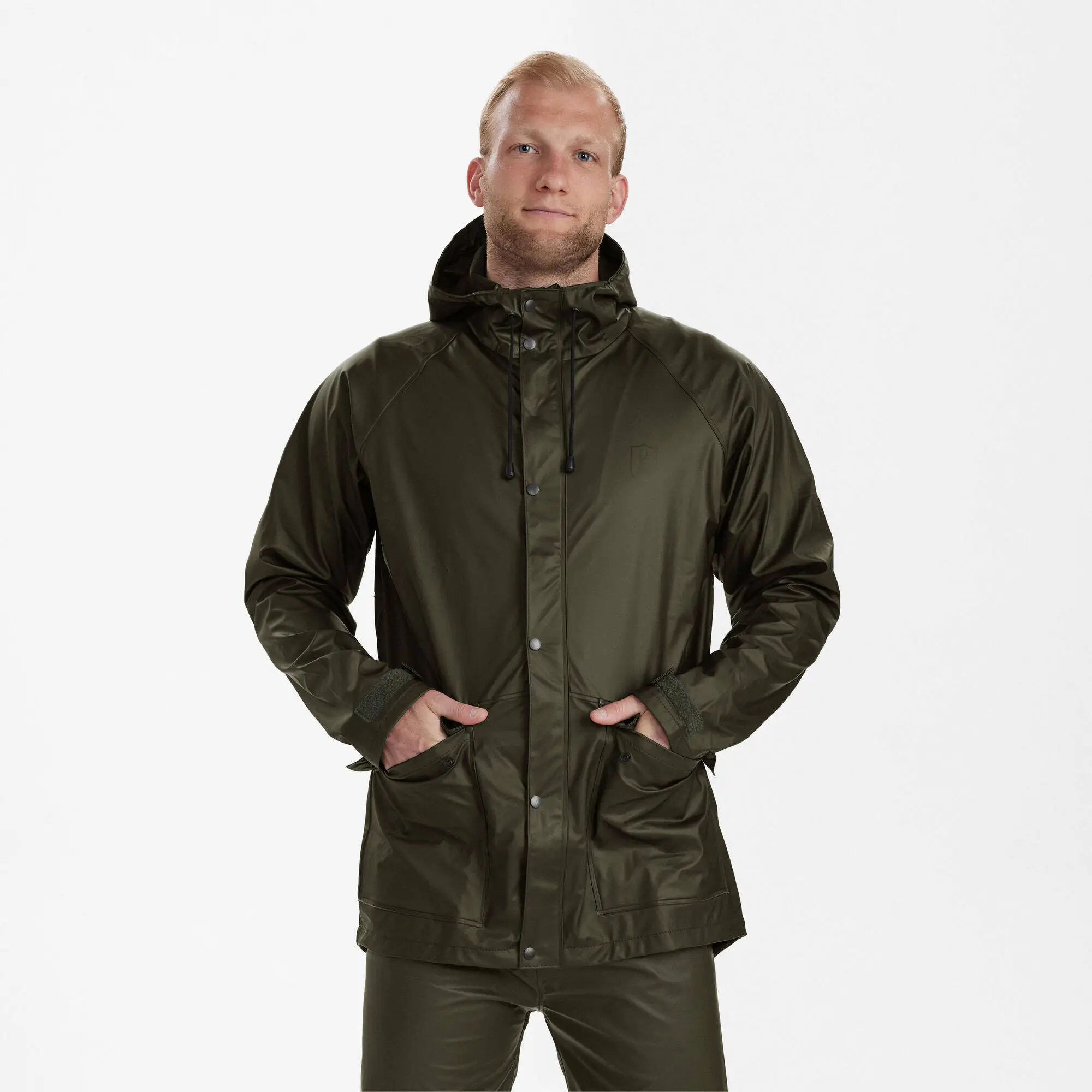 En stor innerficka med blixtlås är perfekt när du behöver extra förvaring för värdesaker som mobil, plånbok eller nycklar. Huvan, som kan justeras med dragsko, ser till att ditt huvud och din nacke är väl skyddade mot regnet. Regnjackan kommer i en enfärgad grön ton som smälter vackert in i naturen samtidigt som den ger ett modernt uttryck. Den funktionella designen kombinerad med modern stil gör den här jackan till mer än bara ett praktiskt plagg; den är också ett stilfullt val för modemedvetna män.