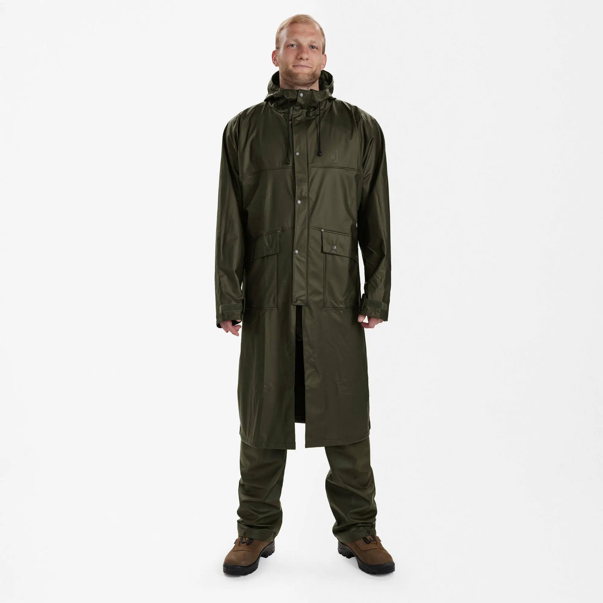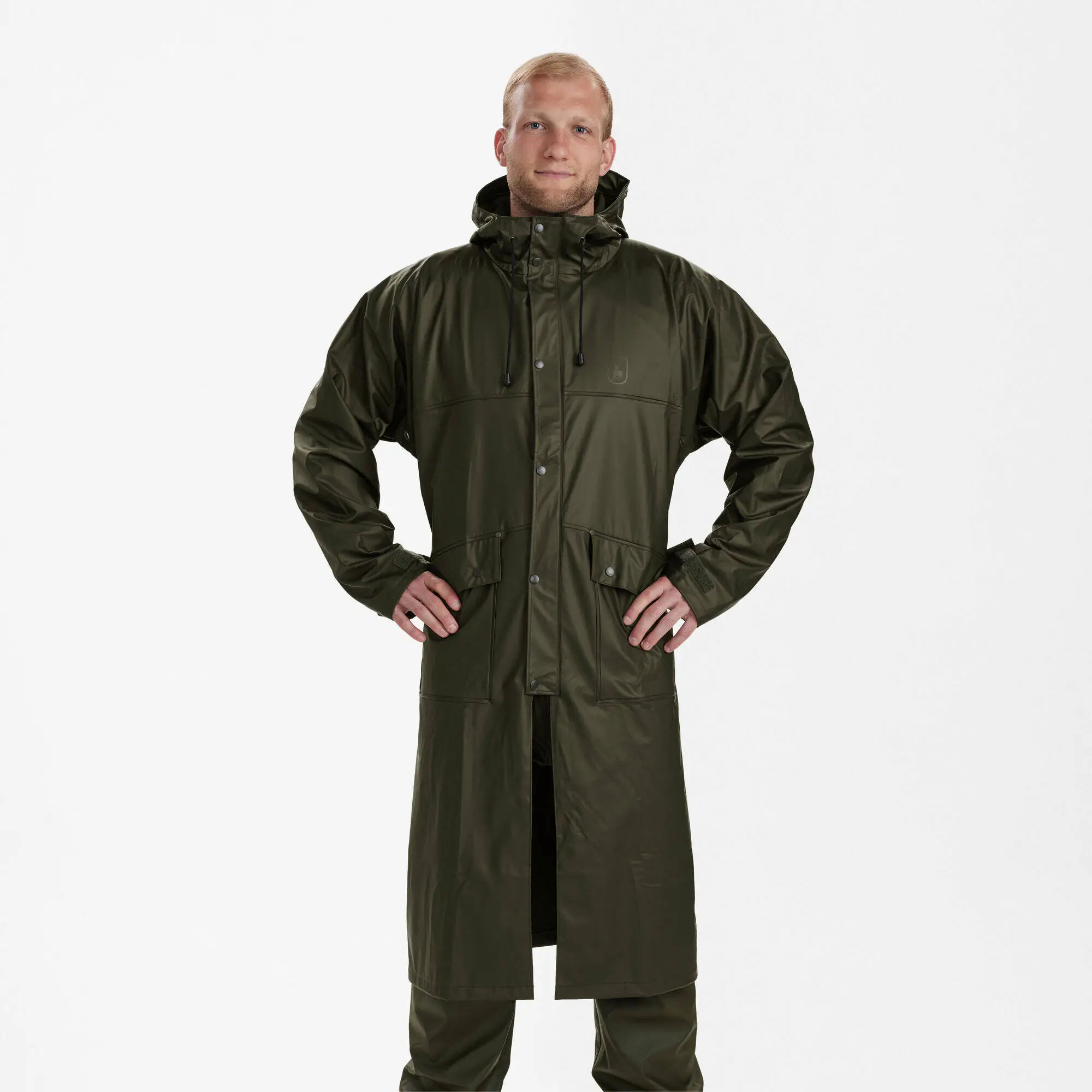 Designen är diskret, med en klassisk enfärgad grön ton som tilltalar både stilmedvetna och praktiska användare. Huvan med dragsko ger extra skydd och kan enkelt justeras för optimal passform. De framfickor med knappar ger praktisk förvaring för småsaker som din telefon eller plånbok. Dessutom säkerställer de justerbara kardborreärmarna en tät stängning som inte släpper in vatten, även under de mest utmanande väderförhållandena.