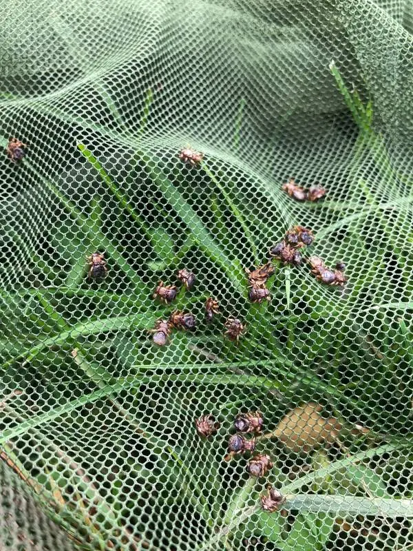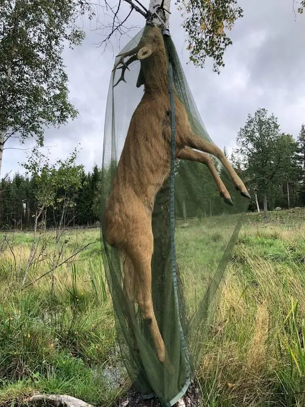 se bilden ovan - efter 20 minuter i nätet var alla fästingar och älgflugor döda - skulle en spyfluga råka ta sig in i nätet, dör den också