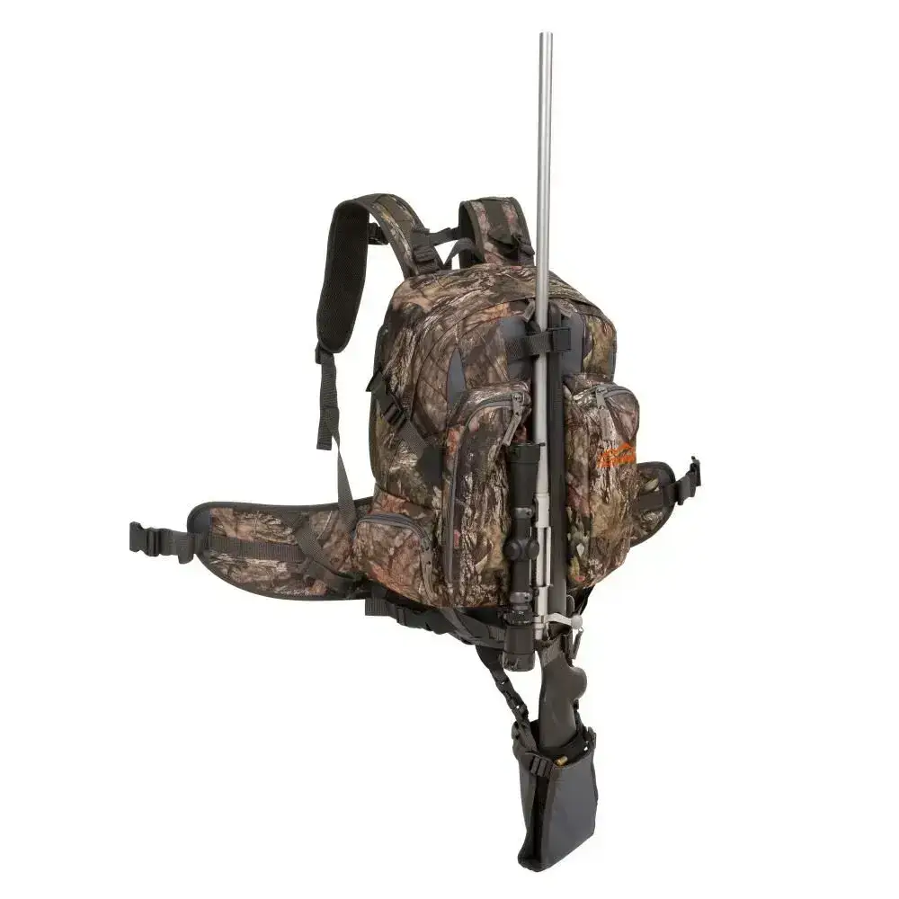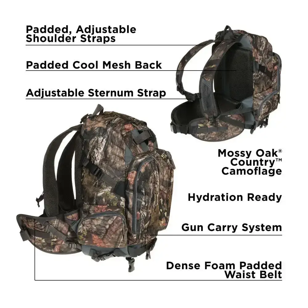 Terrain™ Twin Mesa Daypack har en Mossy Oak® Break-Up Country™ kamouflage-ryggsäck med ett integrerat system för att bära skjutvapen eller pilbåge och gott om förvaringsutrymme för att hjälpa dig hantera din utrustning.