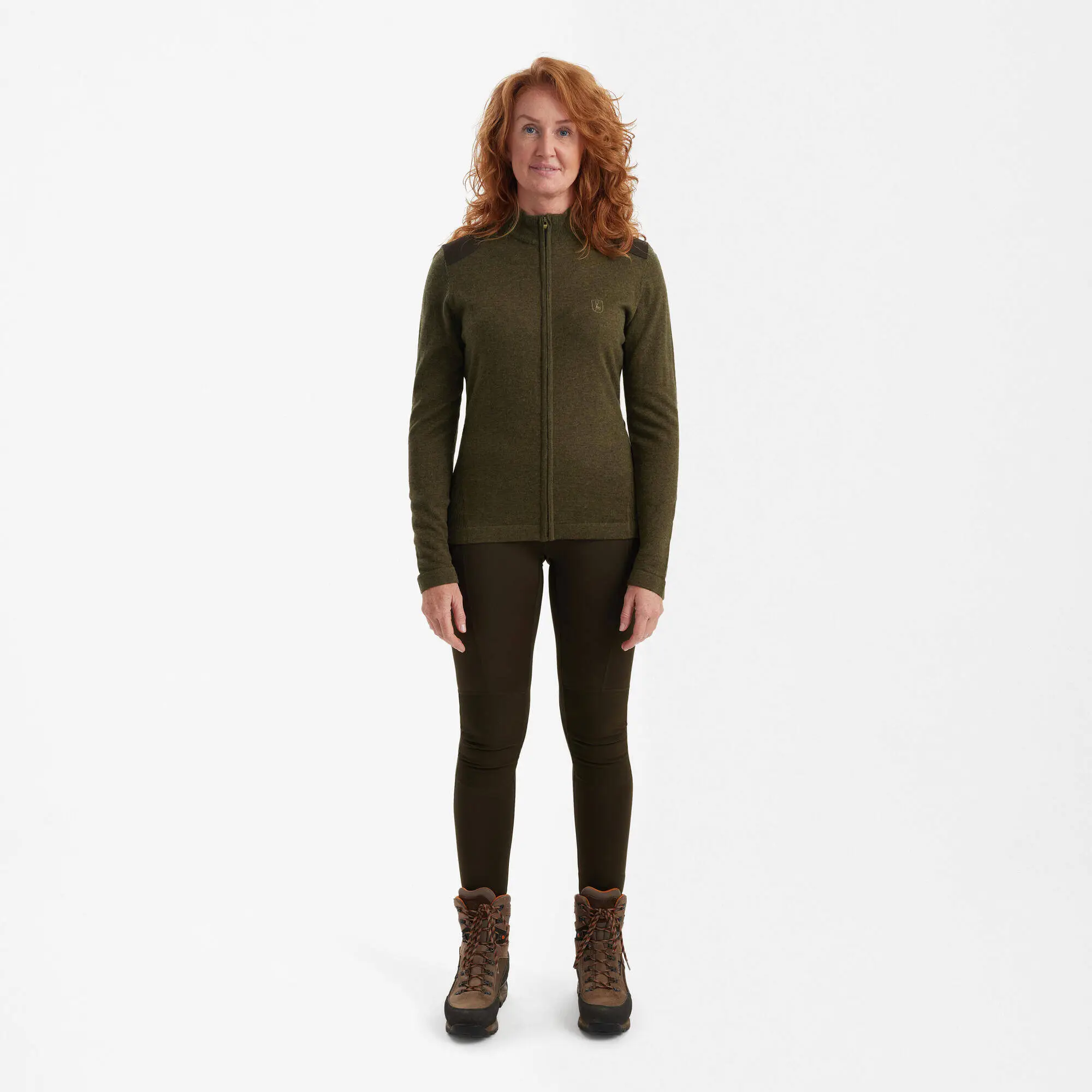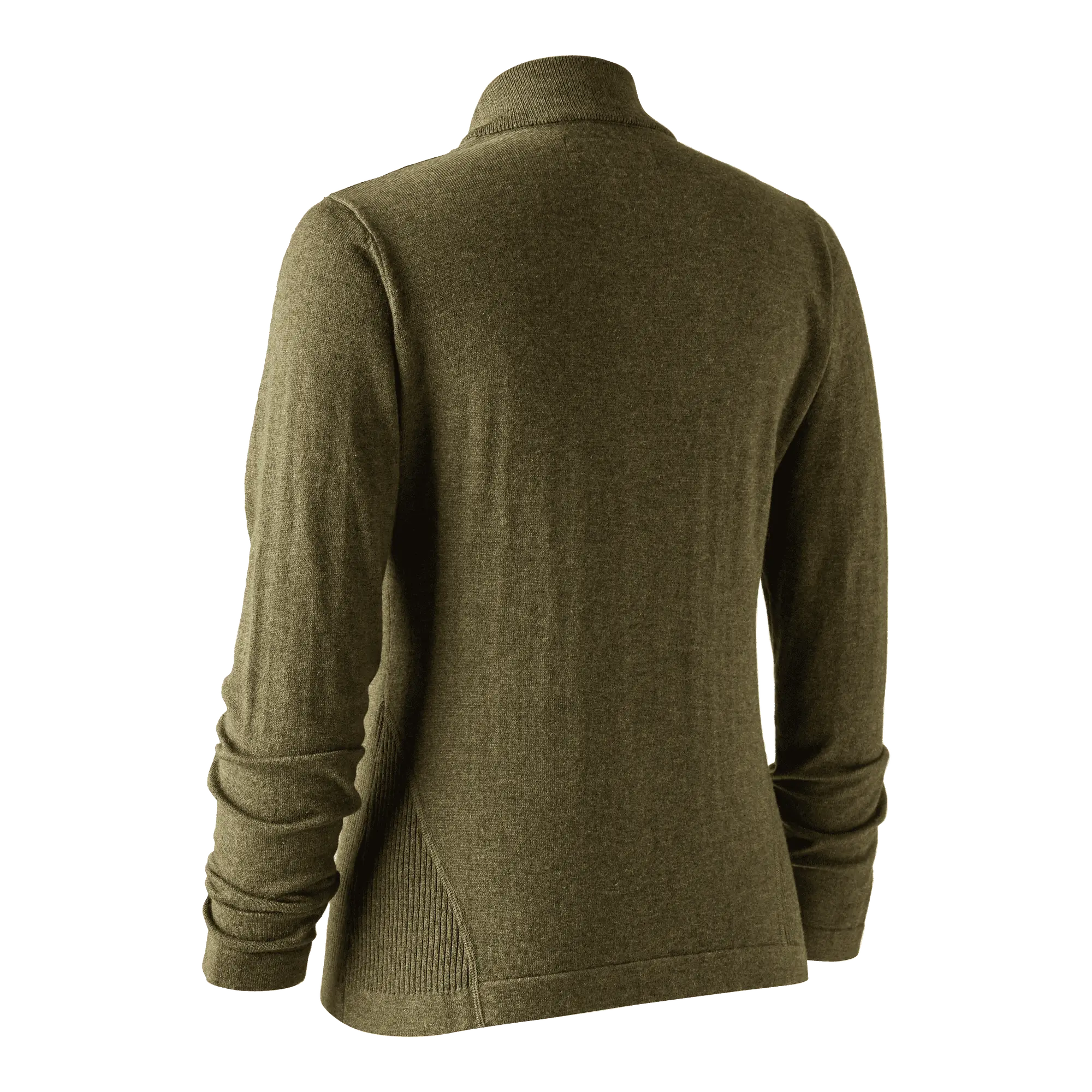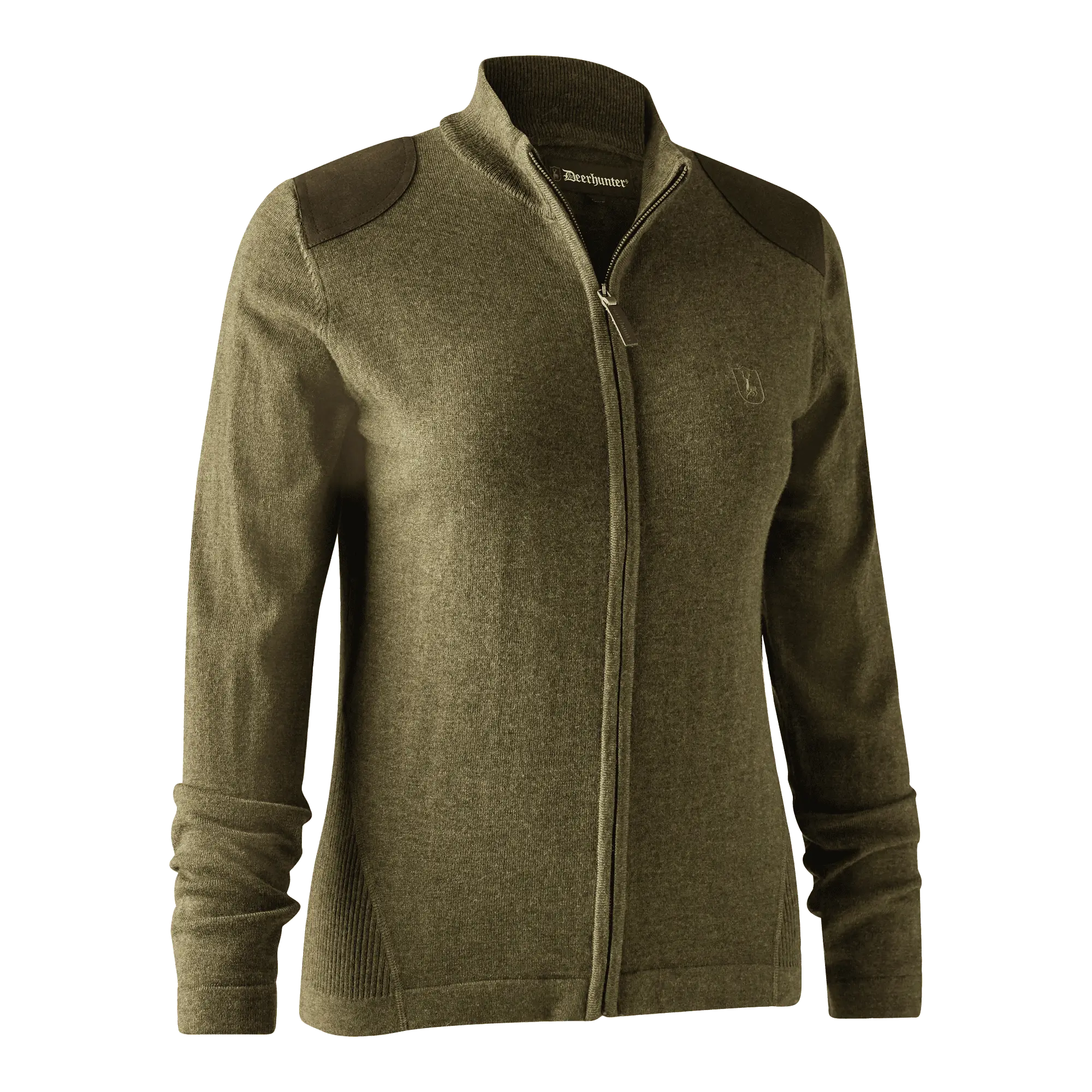 Den taktila njutningen av merinoull är ett utmärkt komplement till cardiganens stilmässiga mångsidighet. Oavsett om den kombineras med avslappnade jeans för en ledig utflykt eller används som ett extra lager för att ge värme under en frisk promenad eller ett utomhusäventyr, håller stickningen för alla tillfällen. Dess karakteristiska höga ribbade krage ger både praktisk och estetisk funktion, med extra värme och en touch av chic sofistikering.