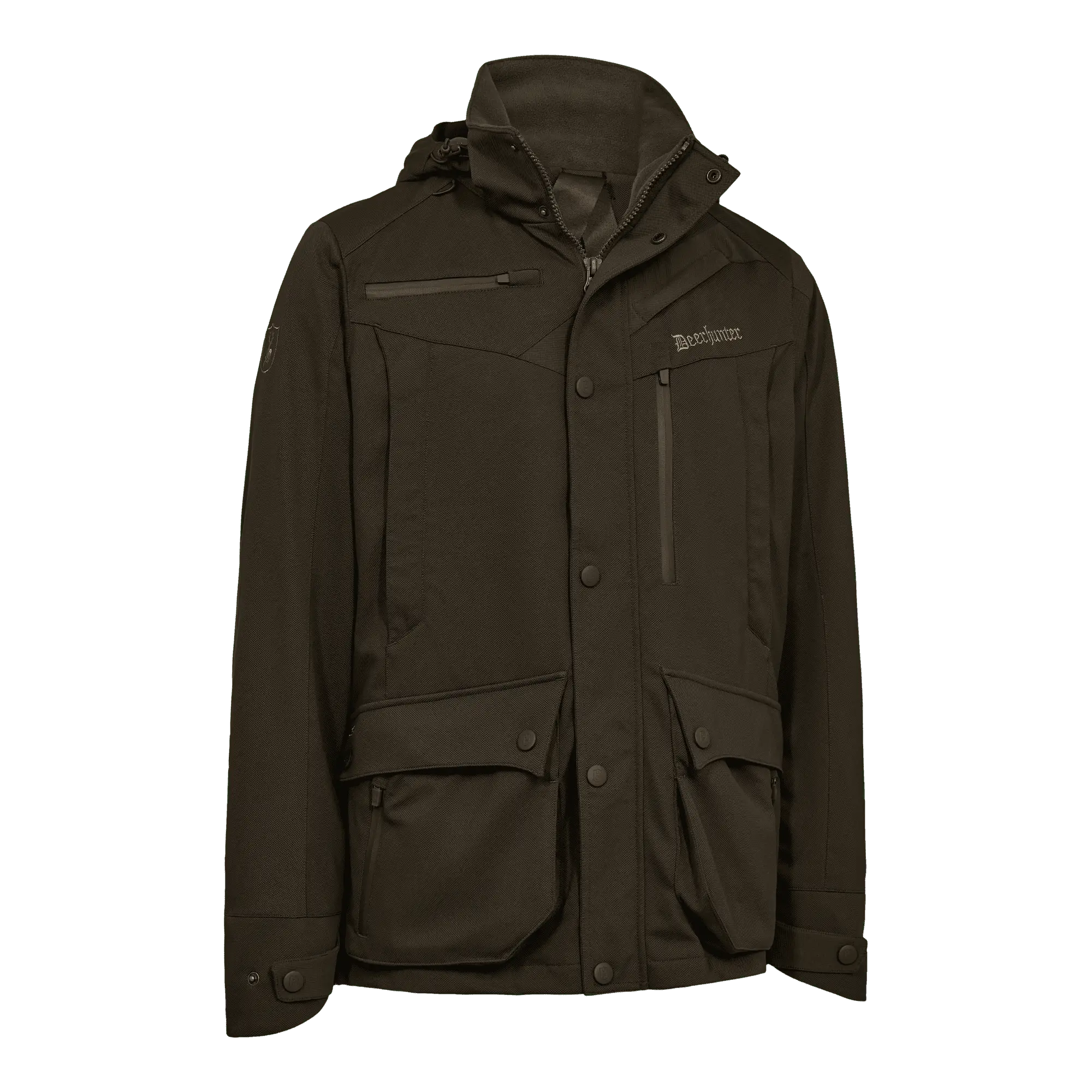 Jackans design inkluderar flera fickor som är noggrant placerade för både funktion och estetik. Radiofickorna med dolda och vattentäta blixtlås är idealiska för att skydda elektroniska enheter mot oförutsägbart väder, medan bröst- och handvärmarfickor ger extra förvaring och bekvämlighet. En innovativ detalj är den avtagbara putsduken i bröstfickan, som snabbt kan användas för att putsa glasögon eller optik ute i fält.