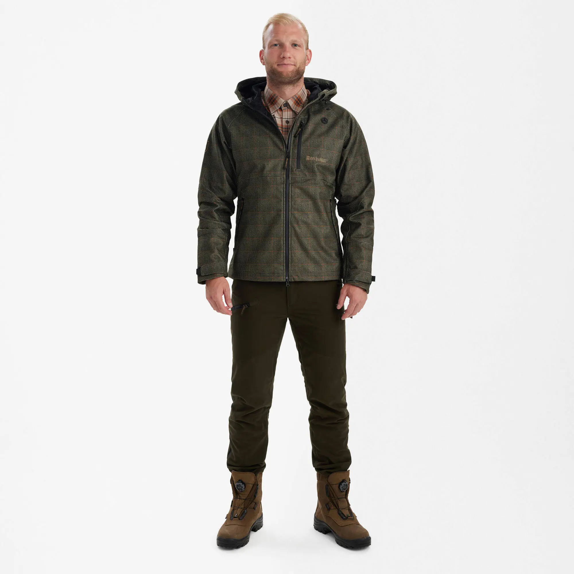 Jackan är tillverkad av material som valts för sin hållbarhet och förmåga att stå emot elementen. Med ett yttermaterial i polyester erbjuder jackan robusthet samt en stilren yta som passar in i vilken friluftsgarderob som helst. Tack vare det avancerade Deer-Tex® Performance Shell membranet ser jackan inte bara till att hålla dig torr utan tillåter också huden att andas genom materialet, vilket är avgörande för komfort vid längre användning.