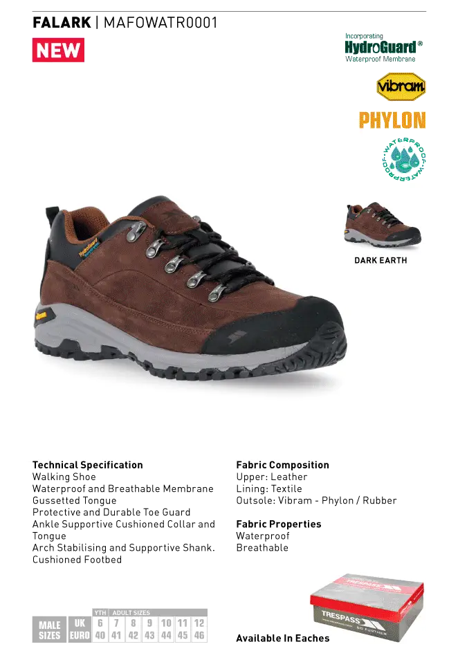 Trespass Falark vandringssko är en praktisk sko för utomhusaktiviteter. Skon är vattentät och andningsbar, samtidigt som den har ett hållbart tåskydd och en ankelskyddande krage
