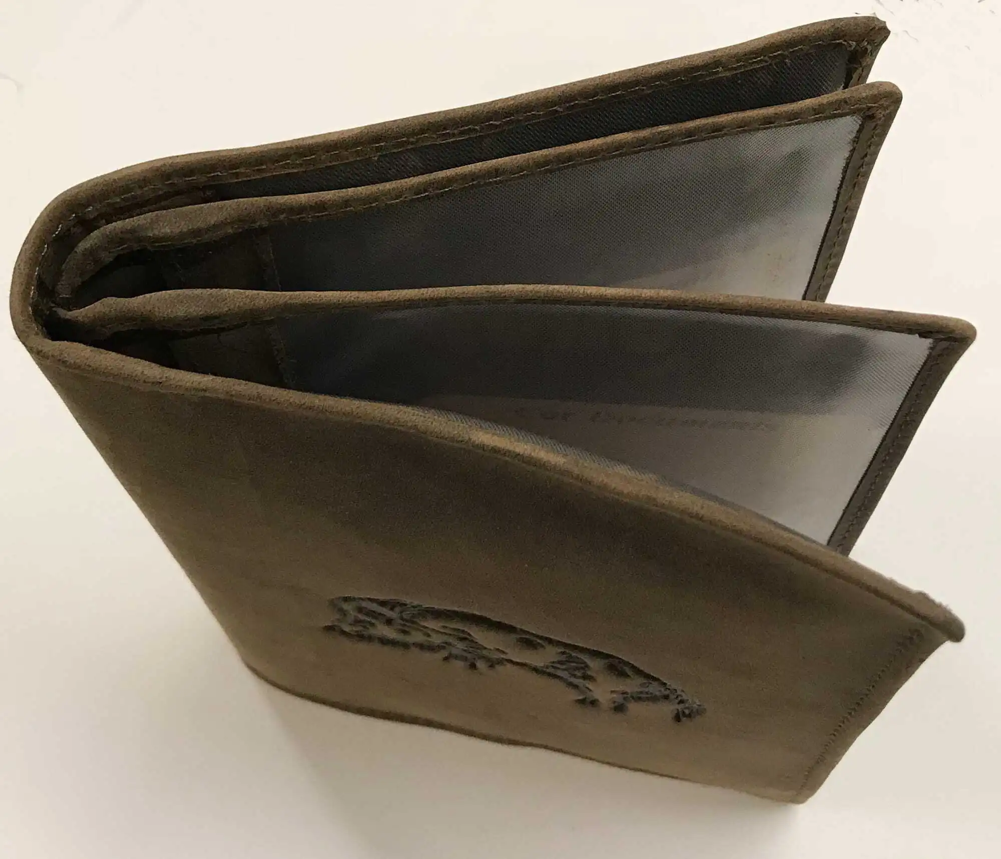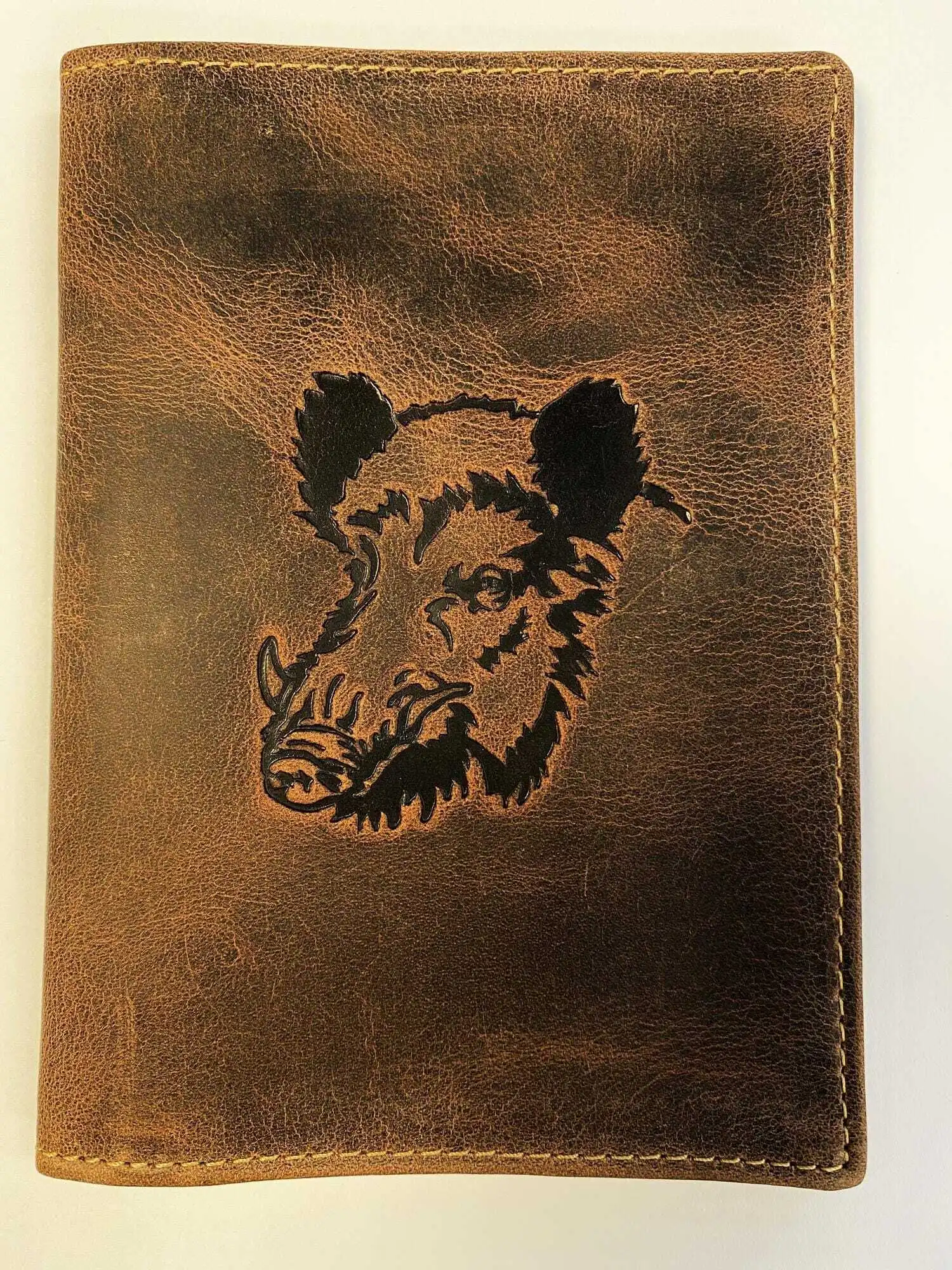 Förvaringsmapp/fodral för jaktpapper i lädermocka med vildsvinsmotiv