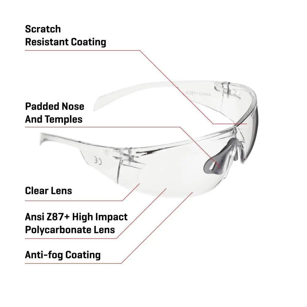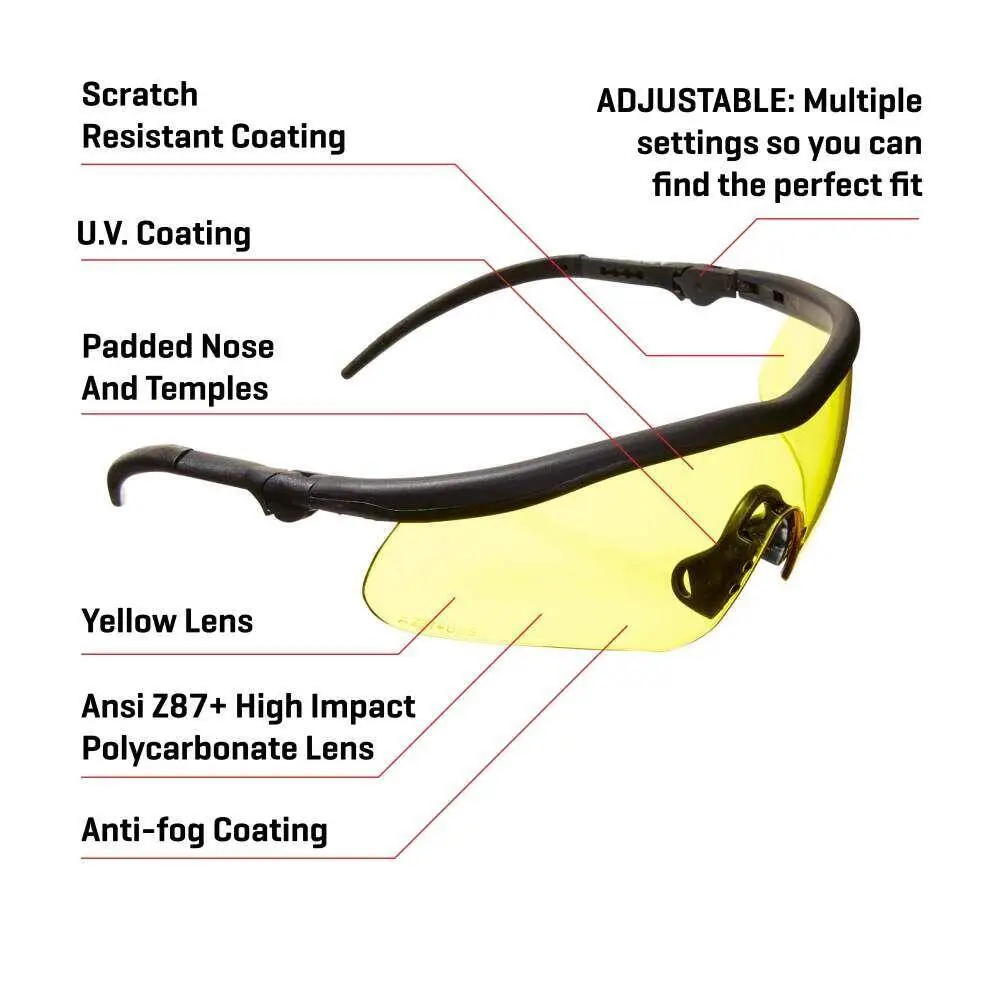 - STÖTDÄMPNING: Tillverkad med en gul, stötsäker polykarbonatlins som uppfyller ANSI Z87+ stötdämpningsstandard.