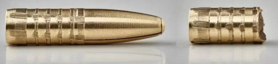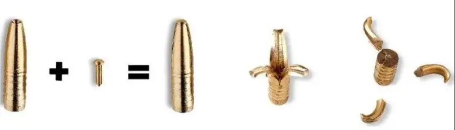 Stiftet mitt i projektilen säkerställer normal funktion i geväret samt förutsägbar och helt jämn fragmentering av projektilen.