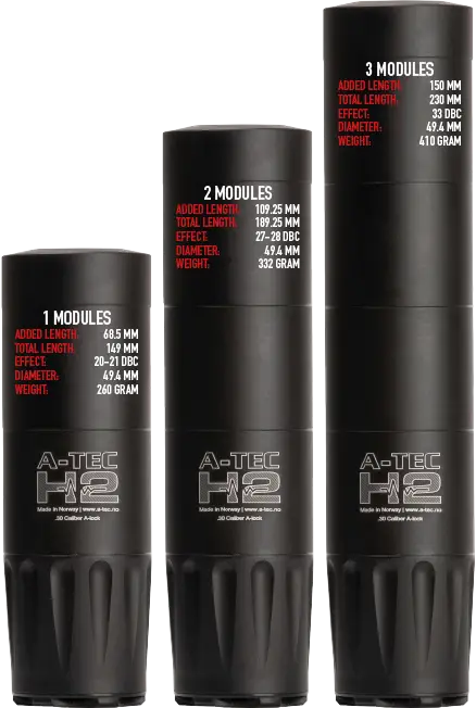 Den har förbättrad teknik, och den är mycket effektiv vid det första skottets "pop"/kallpipsslag. A-tec H2 är modulär för att ge användaren möjlighet att montera den som en 1-, 2- eller full 3-modulsvariant. (alla våra modeller på lager är 3-modulsversioner)