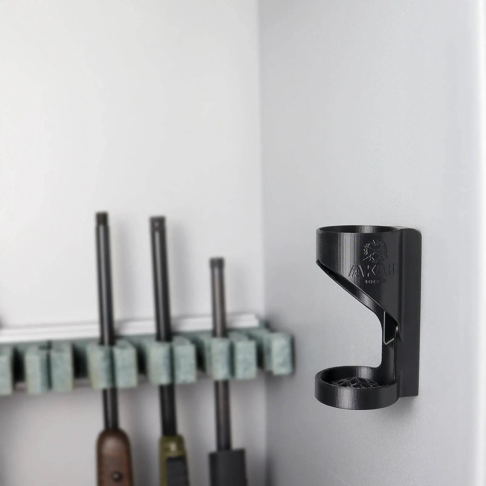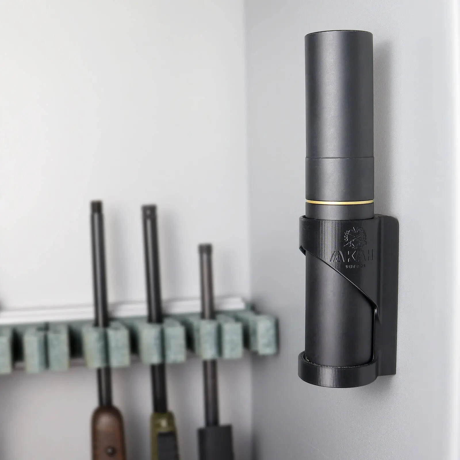 Plasthållaren för ljuddämpare har en stark magnet på baksidan som förhindrar oönskad glidning. De två "nyckelhålen" möjliggör enkel fastsättning på lämpliga ytor. Det uppåtböjda ventilationsgallret under hållaren säkerställer god luftcirkulation och centrerar ljuddämparen.